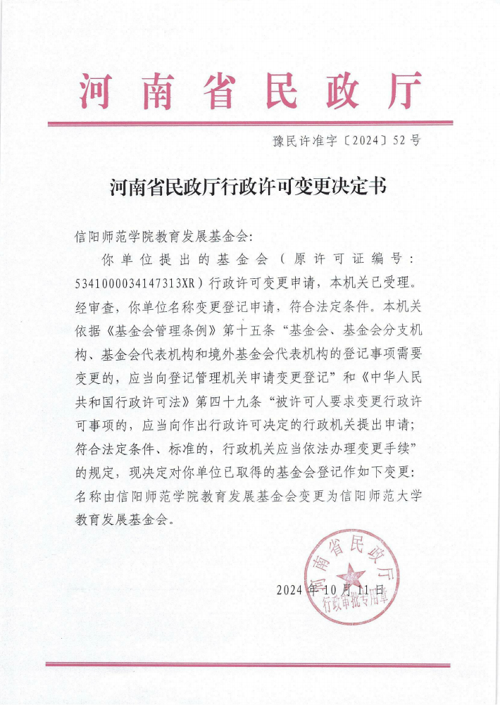 2015年9月30日,河南省民政厅印发《河南省民政厅关于同意信阳师范学院教育发展基金会设立登记的批复》(豫民函〔2015〕244号),并于2015年10月10日颁发《基金会法人登记证书》(豫民基证字第0119-F号),我校基金会正式成立。此后,校友联络办公室积极推进后续相关业务手续的办理,取得了税务登记证,开通了基金会银行对公账户,基金会各项工作得以有序开展。